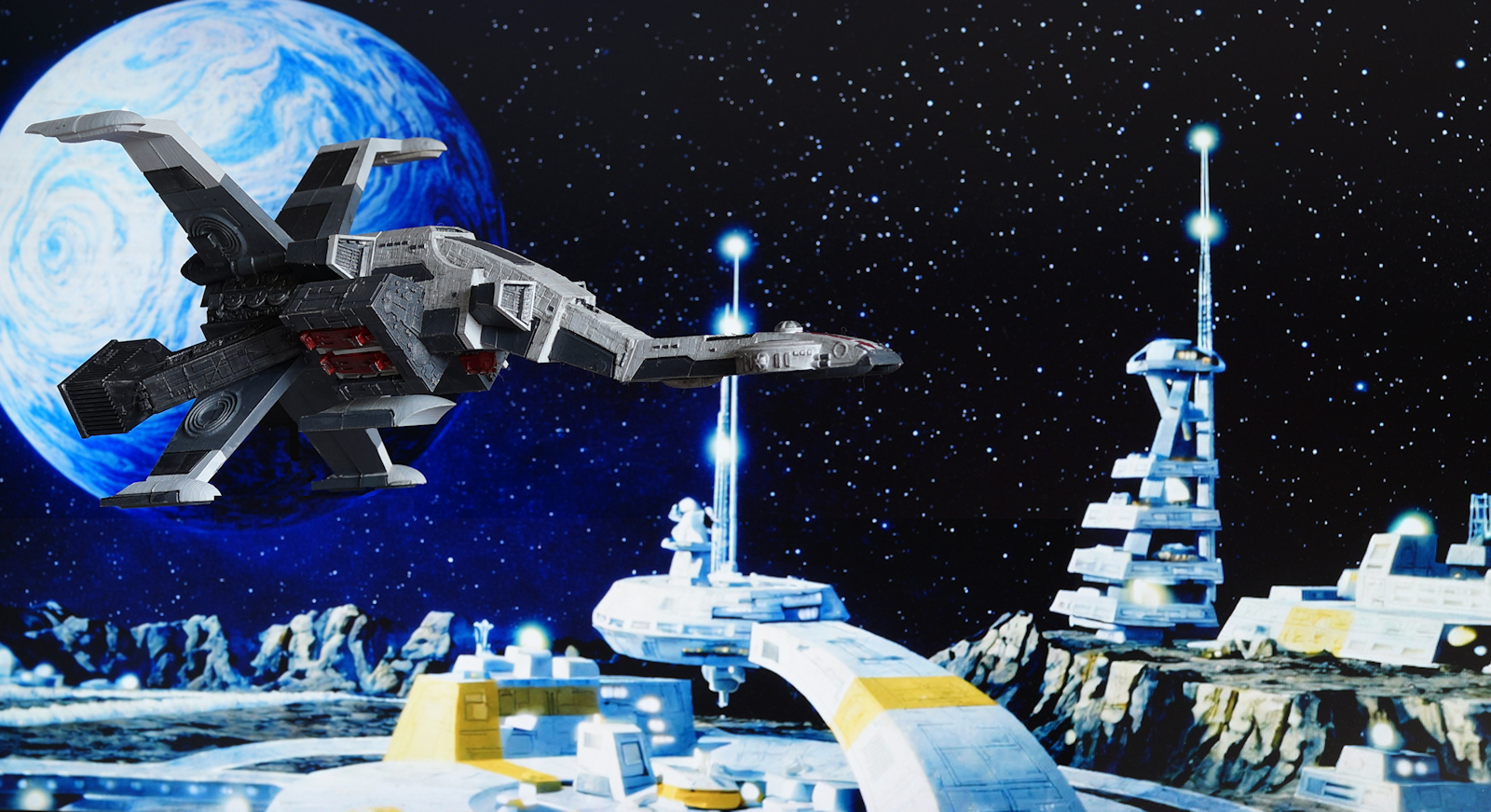 And there she is, the X-Bomber of my childhood dreams given form at last, a beautiful rendering with (as far as I'm concerned) the correct colours. Honestly, every time I've walked past this beast I've just been grinning. It's perfect. A second model was popped on Ebay and sold within a few days, so clearly I'm not the only one who wanted this ship (whoever bagged the other, you're welcome!) So now I've been able to replicate the shot of X-Bomber flying over the series' beautiful moonbase (as seeen at the head of this article and in more detail below) and give the magnificent Dai X a partner truly worthy of the series' legacy.