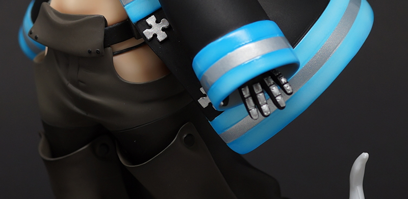 Tomaki Kotatsu is a junior member of the Fire Force, and in this figure she's depicted in her standard uniform - black underwear covered by more utilitarian fire-fighters trousers, boots and long jacket. The blue rings across her uniform will glow in the dark or light up under a black-light, just as they do in the show itself.